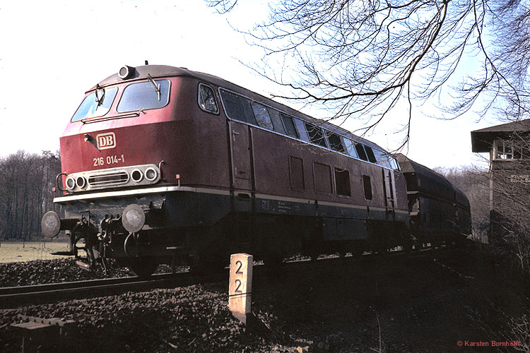 Am Abzweig Anger fährt 216 014-1 aus Richtung Duisburg kommend nach Rohdenhaus. 7.3.1982.