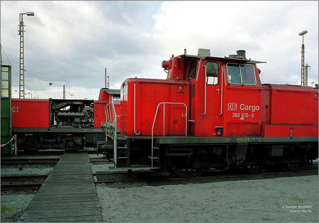 360 610-0 hat immerhin noch die verkehrsrote Farbe bekommen, aber auch das half nicht zu überleben: z 05.11.2002, + 22.12.2004, dann verkauft an die BEG (Bocholter Eisenbahn Gesellschaft mbH) und kurz darauf bei Steil in Köln-Deutz verschrottet.