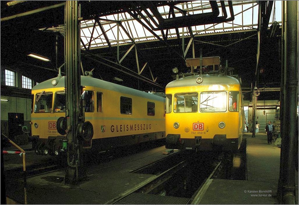 Während der Gleismesszug 726 004-5 / 725 004-6 auch 2009 noch im Einsatz ist und am Wochenende meistens im Gleisvorfeld von Hagen Hbf steht, wurde der rechts stehende 702 050-6 am 15.12.2006 beim Bh Hamm ausgemustert.