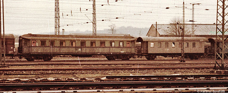 Ganz schwach kann ich mich an diesen Wagen erinnern: Ein ehemaliger preußischer D-Zug-Wagen in einem Bauzug im Dezember 1972 in Wuppertal-Vohwinkel.
