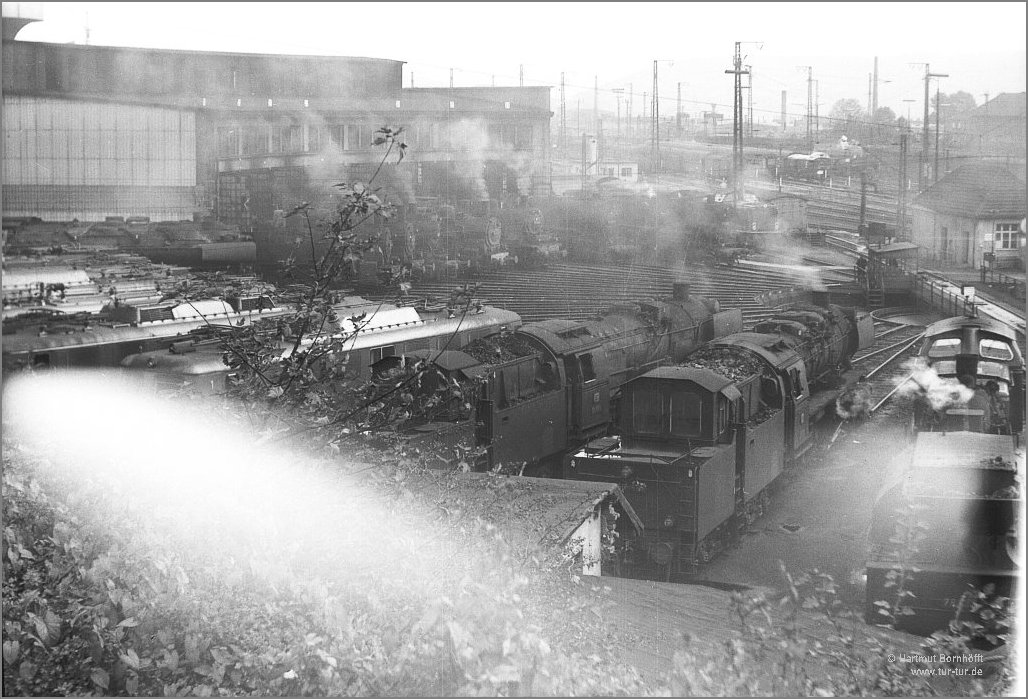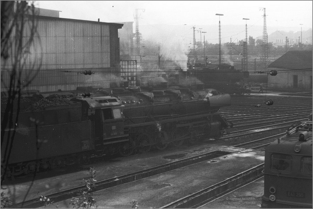 Es dampft noch überall, Dampfloks der Baureihen 44, 50, 86 und 94. Aber auch die Ablösung ist bereits vorhanden: E40, E41 und V100. Bw Wuppertal-