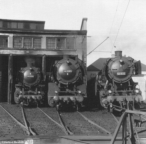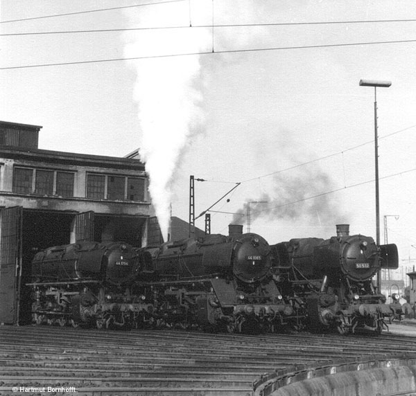Samstagsruhe im Bw Vohwinkel am 25.März 1967: 44 1754, 44 1065 und 50 532 warten auf den nächsten Einsatz.
