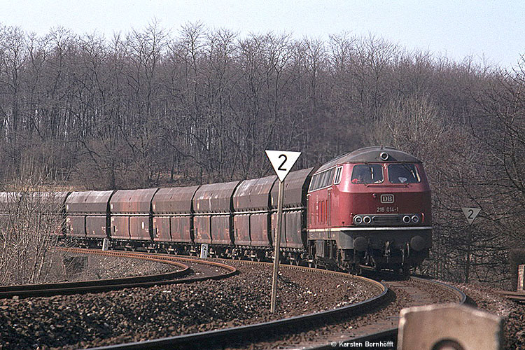 Am Abzweig Anger fährt 216 014-1 aus Richtung Duisburg kommend nach Rohdenhaus. 7.3.1982.