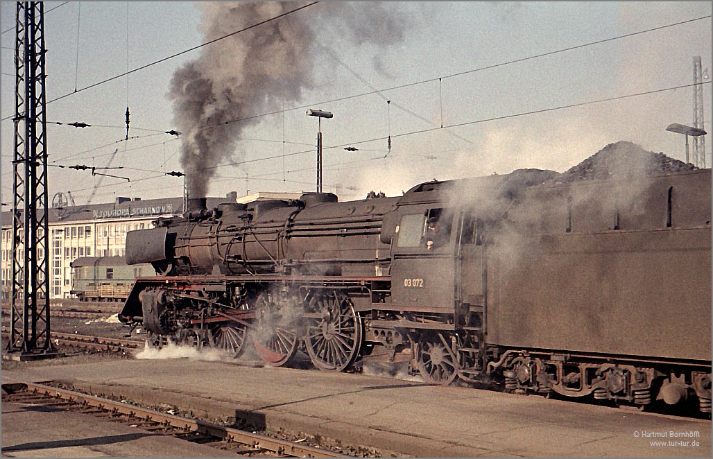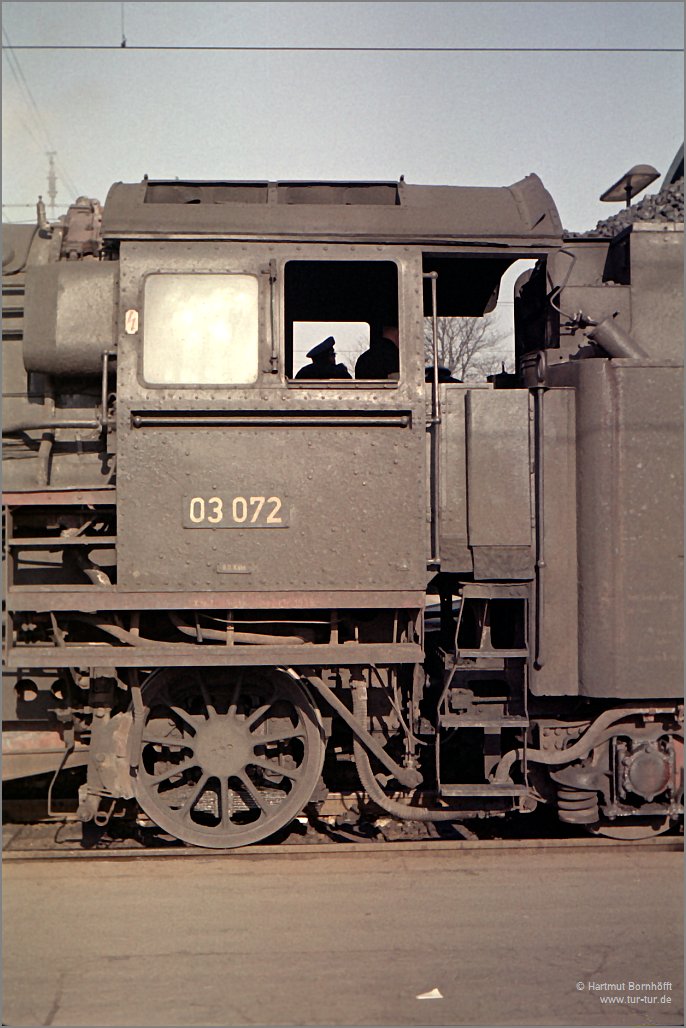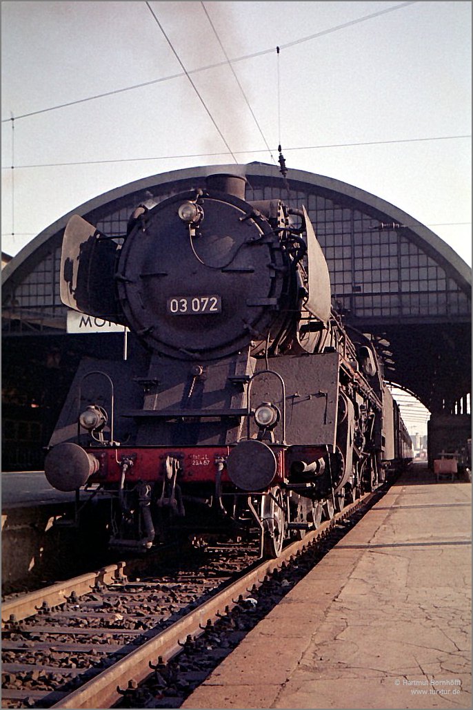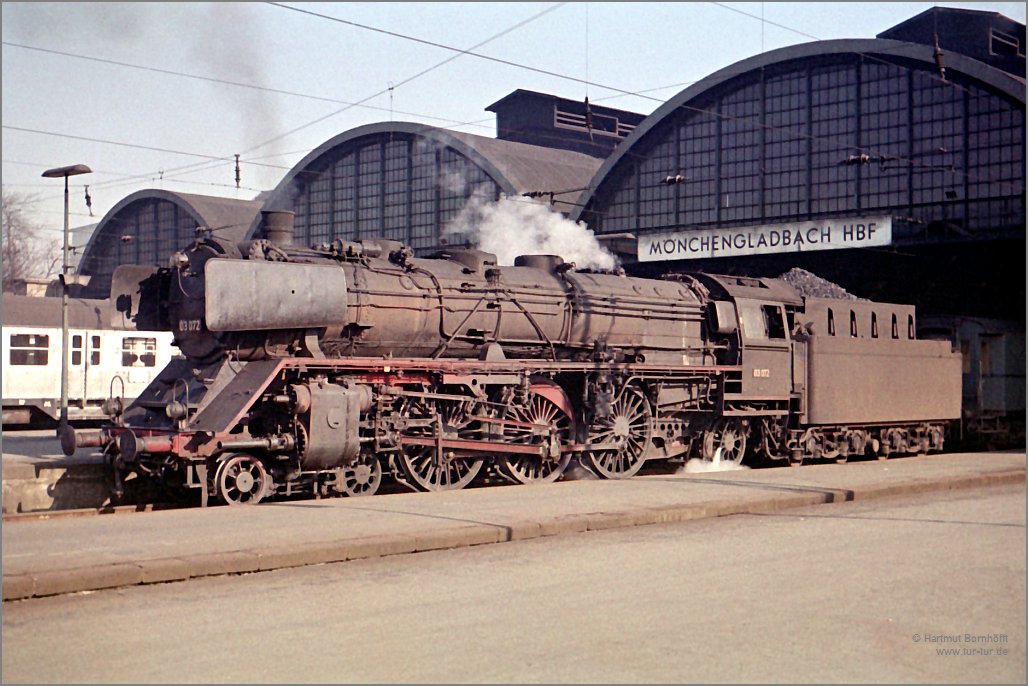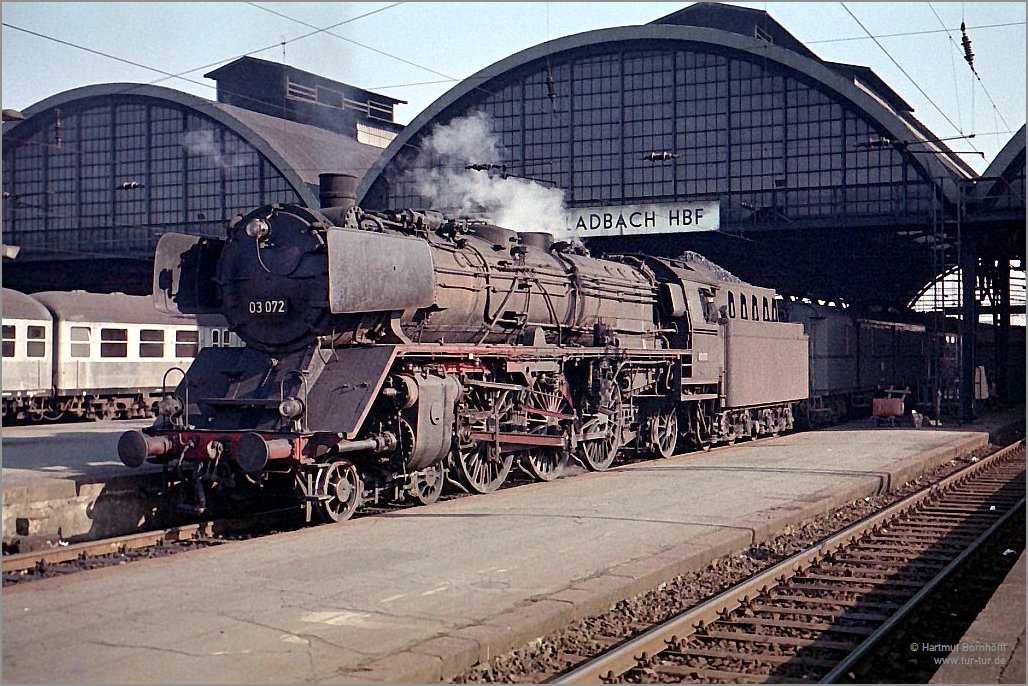 03 072 vom Bw Mönchengladbach ist mit ihrem Eilzug Hagen - Aachen in Mönchengladbach Hbf angekommen und wartet auf Ausfahrt. 30.3.1968