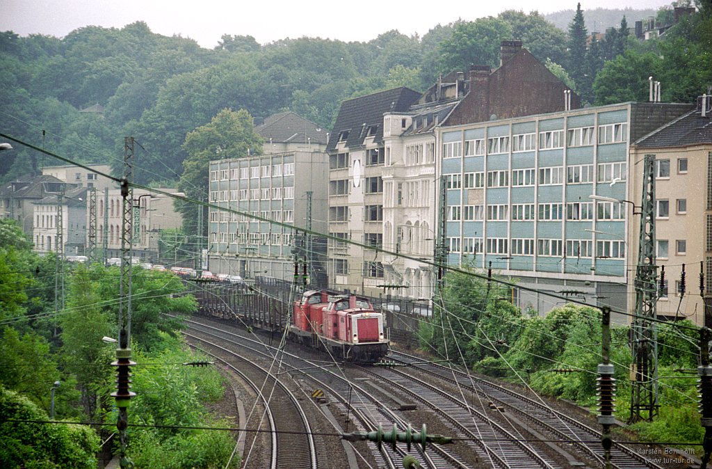 Am 20.7.2001 wurde der abendliche Güterzug Remscheid - Köln-Kalk anstelle mit einer 215/225 mit 212 266-1 und 212 255-4 bespannt. Aufgenommen in Wuppertal Hbf im strömenden Regen.