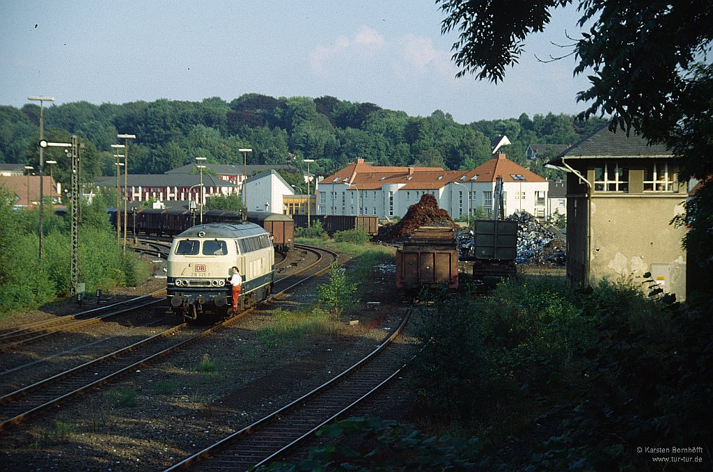 Eine kleine Übersicht über den Bahnhof Wülfrath bzw. was am 25.8.1994 davon übrig war: 216 025-7 hat gerade den abendlichen Güterzug Velbert - Duisburg-Wedau nach Wülfrath gebracht und setzt nun ans andere Zugende um.