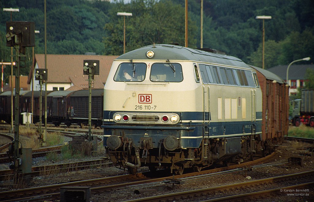 216 110-7 mit dem abendlichen Güterzug Velbert - Duisburg-Wedau am 24.8.1994 in Wülfrath