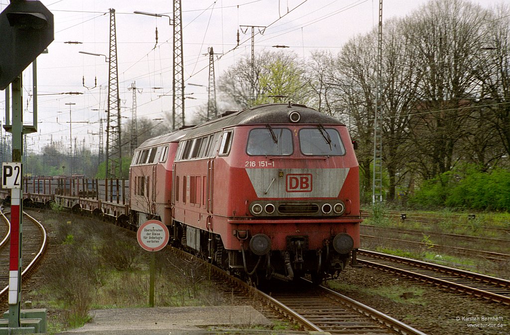 Am 14.4.2001 durchfuhren 216 151-1 und 216 156-0 vom Bh Oberhausen den Bahnhof Wanne-Eickel Hbf mit einem Stahlbrammenzug von Krefeld/ Edelstahlwerke nach Dortmund/ Krupp (oder war es Hoesch?).
