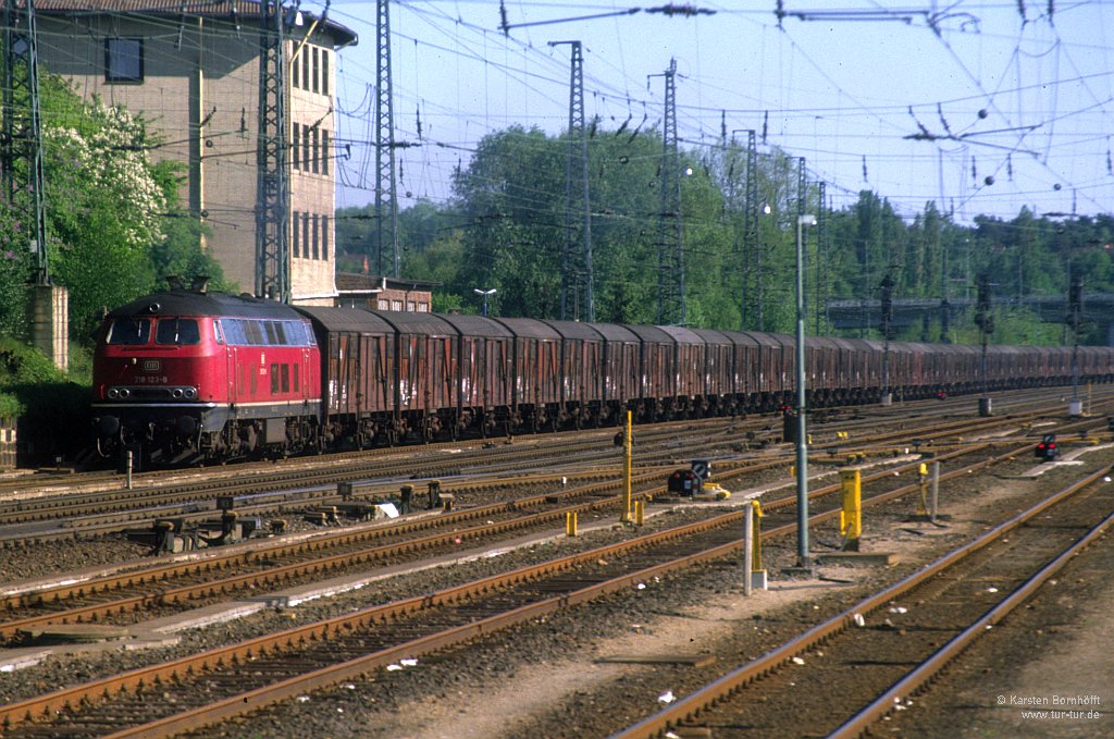 DAS ist ein Stückgutzug ! 218 123-8 vom Bw Flensburg bei der Ausfahrt aus Lüneburg Gbf, August 1987.