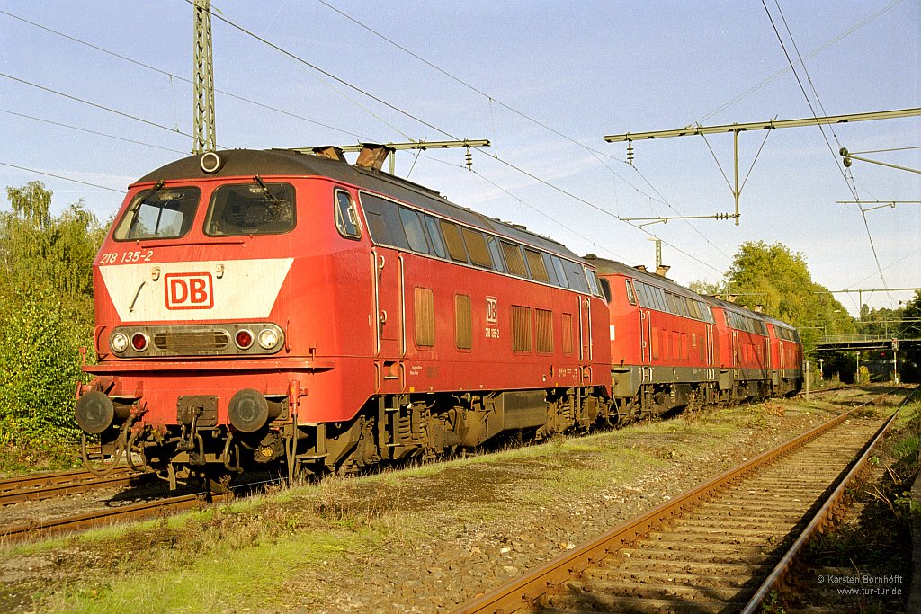 Kurz vor der Schließung ihres Heimat-Bw’s Hagen wurden bei einigen Hagener 218 die Fristarbeiten bei der Westfälischen Lokomotivfabrik Karl Reuschling in Hattingen durchgeführt. Deshalb standen am 12.10.2003 die 218 135-2, 218 247-5, 218 126-1 und 218 009-9 im Bahnhof Hattingen abgestellt.