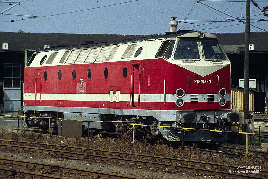 Ein U-Boot an der Ostseeküste: Die Schweriner 219 013-0 sonnt sich etwas weiter nördlich am 21.8.1996 im Bw Wismar.