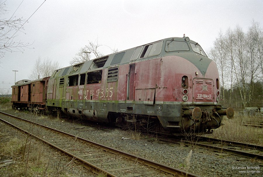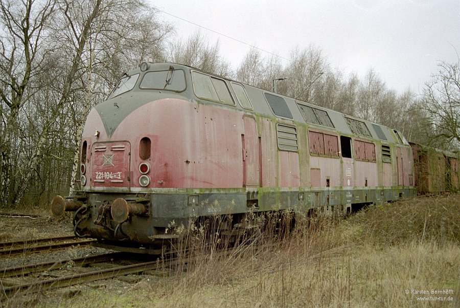 dritte V200.1/221 in Deutschland: Die hier abgebildete 221 104-3. Zuerst war sie in Oberhausen-Osterfeld Ersatzteilspender für die 221 116-7, und nachdem diese nach Lübeck abgegeben wurde, war sie dort erstmal überflüssig.