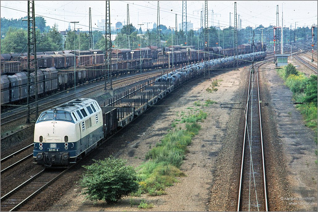 Ein Drahtrollenzug im Jahre 1980: 221 111-8 erreicht am 31. Juli Duisburg-Wedau.