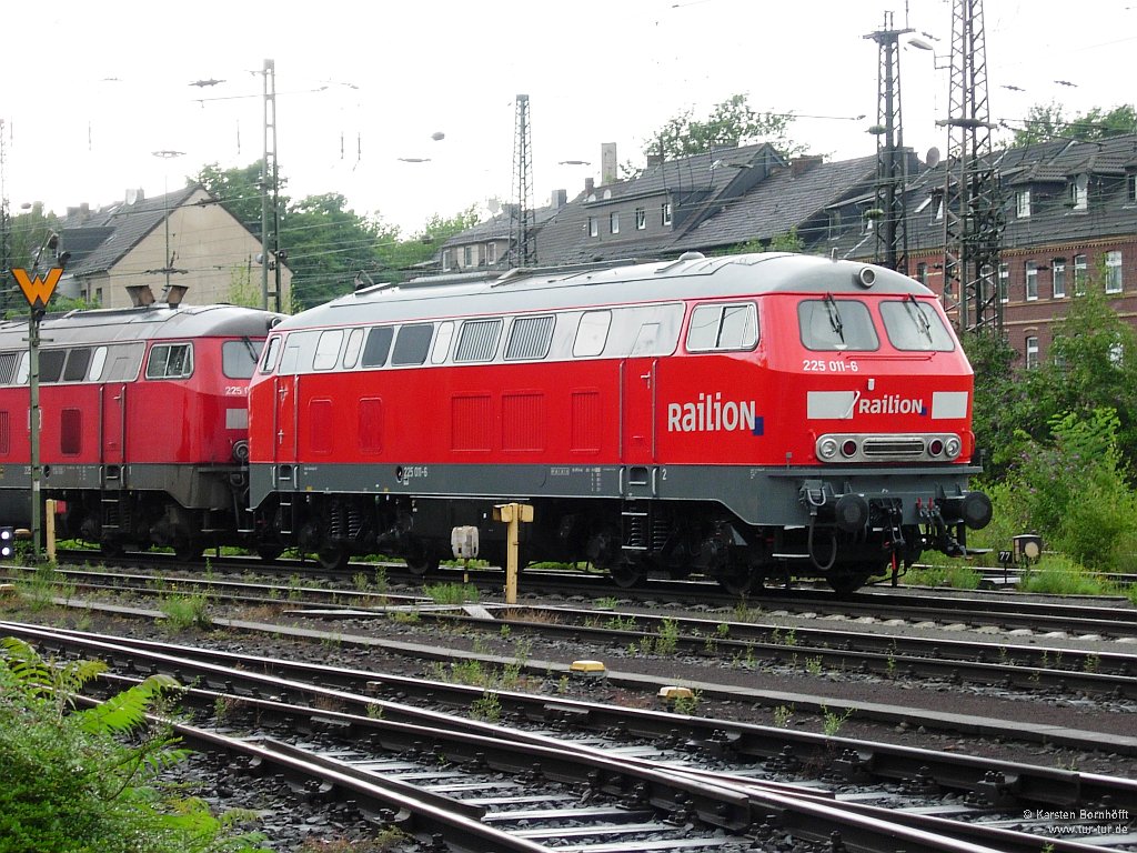 225 011-8, die erste 225 in vollen Railion-Farben, war erst am 28.7.2005 in Bremen hauptuntersucht worden und stand am 5.8.2005 frisch lackiert vor ihrer älteren Schwester 225 001-7 im Bh Oberhausen-Osterfeld.