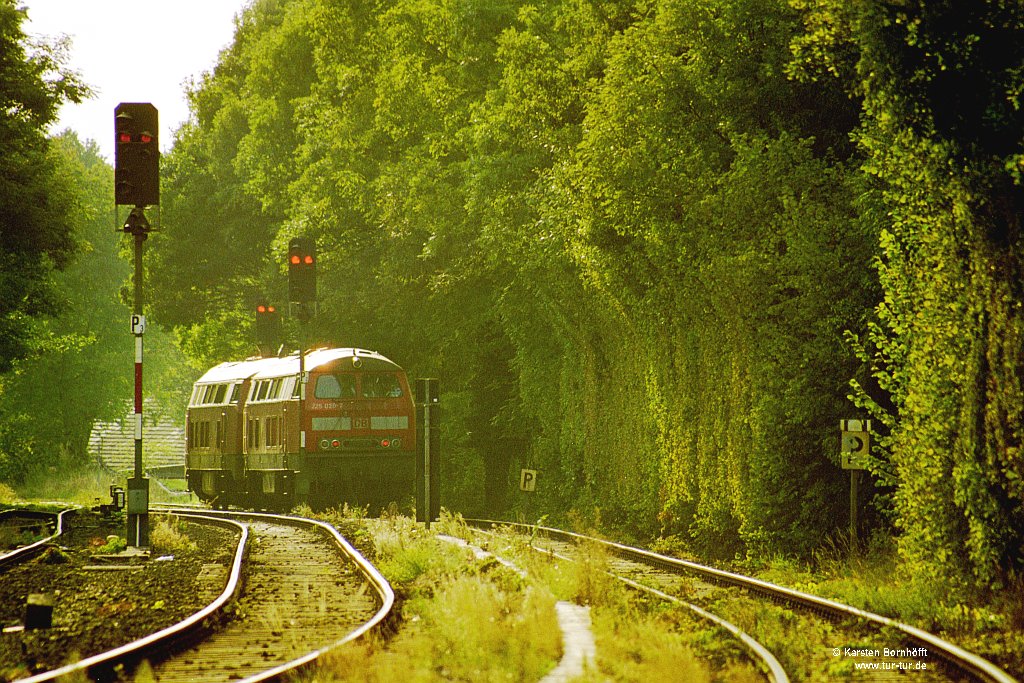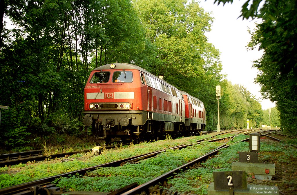 nach Oberhausen West. Der Heckenschnitt rechts von den Loks wird übrigens durch die auf der Angertalbahn verkehrenden Kalkwagen vollautomatisch erledigt.