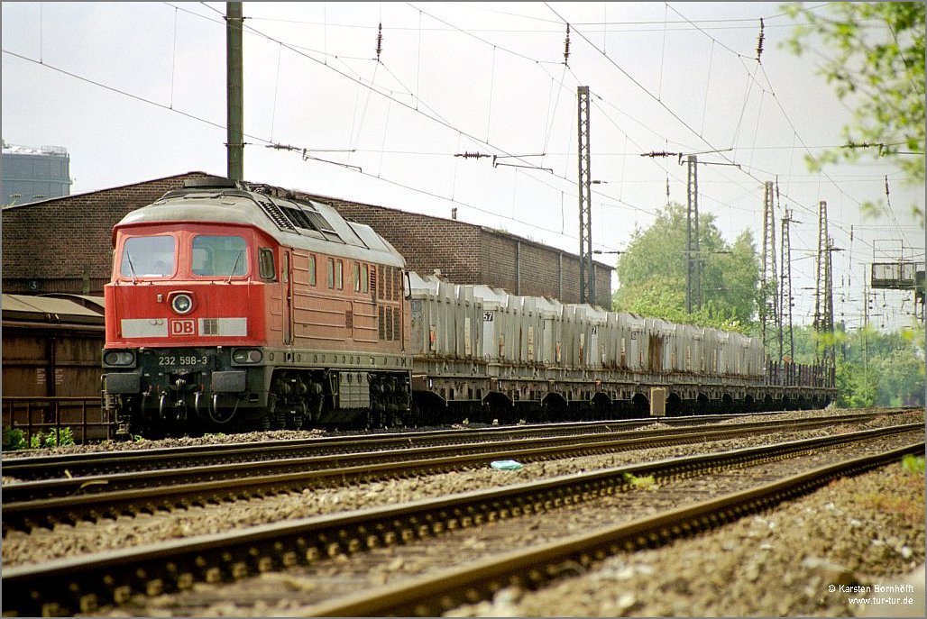 Mit einem Warmstahlzug durchfuhr 232 598-3 am 16.5.2003 Oberhausen-Osterfeld.