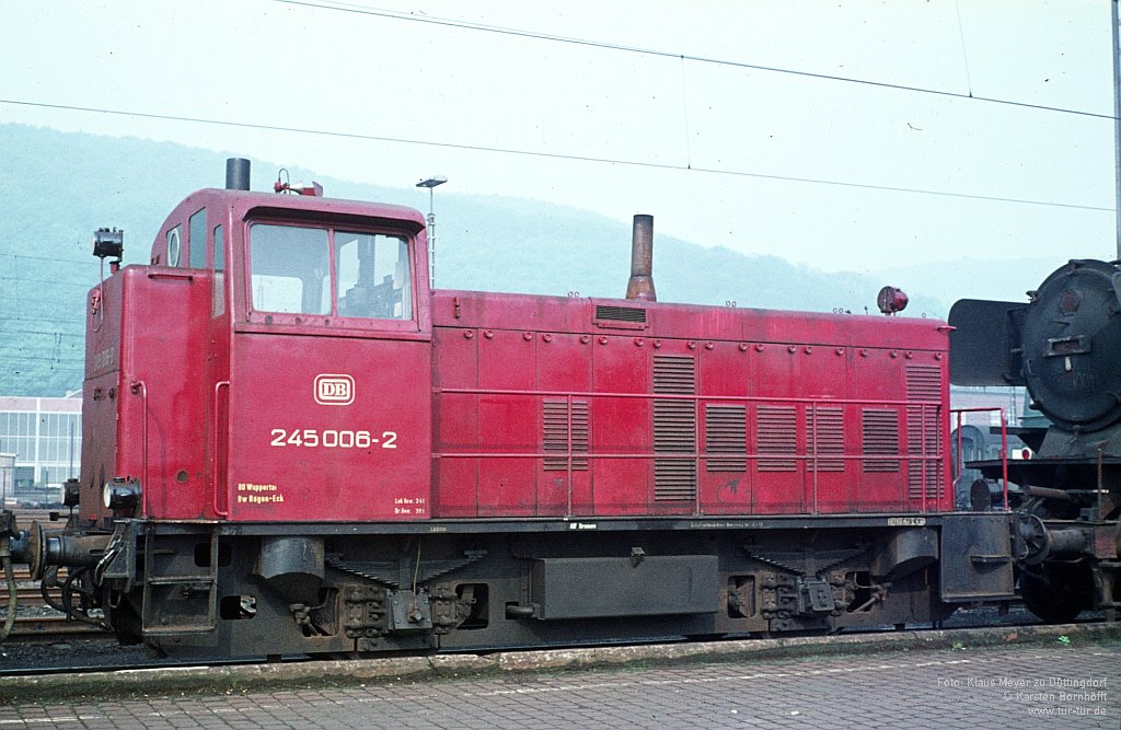 Zusammen mit 03 1001 steht 245 006-2 im Bw Hagen-Eckesey auf dem Schrottlokgleis. Heute stehen hier nach Schließung des Bw Hagen-Eckesey zahlreiche Schwerlastwagen der DB Tochter NCR. Aufnahmedatum etwa 1969.