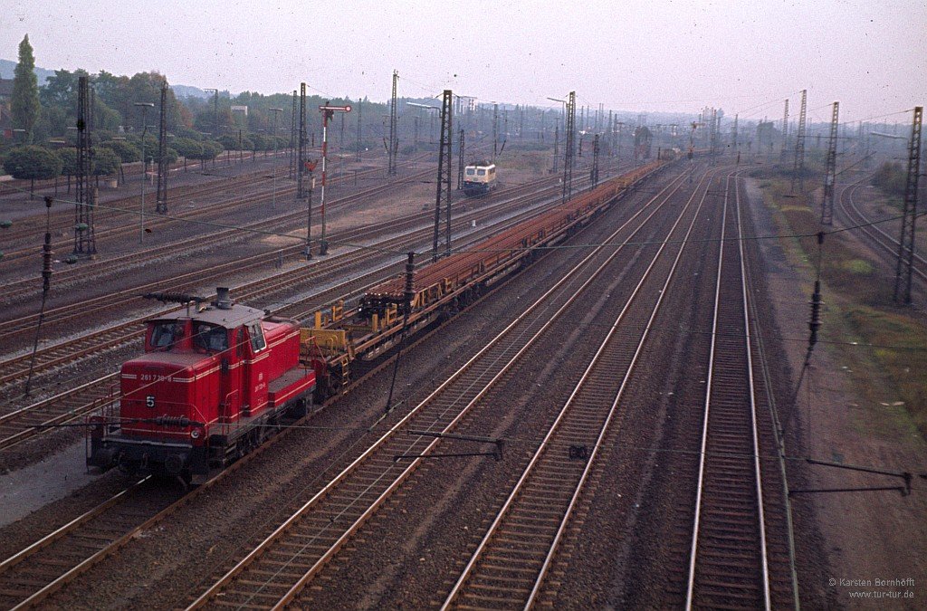 261 729-8 rangierte am 20.7.1981 mit einem Schienenzug in Duisburg-Wedau.