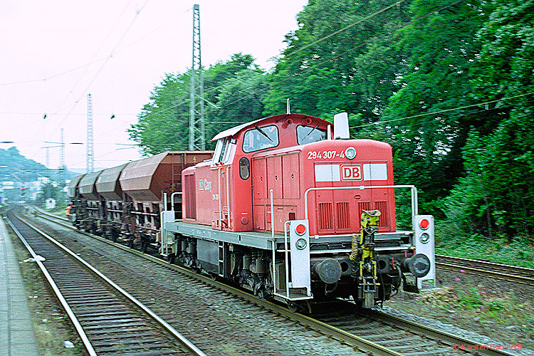 Wegen einer Brückenbaustelle zwischen Wupertal Hbf und Wuppertal-Unterbarmen fuhr am 5.7.2003 294 307-4 als Falschfahrt auf dem gesperrten Ferngleis zur Baustelle.