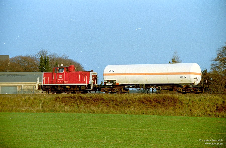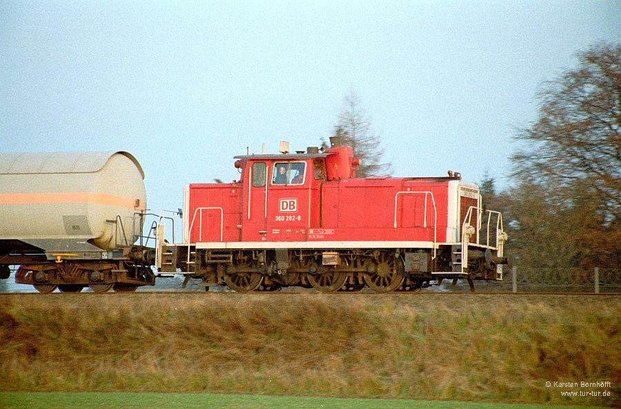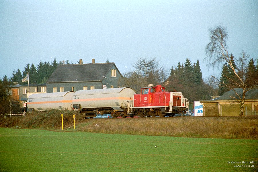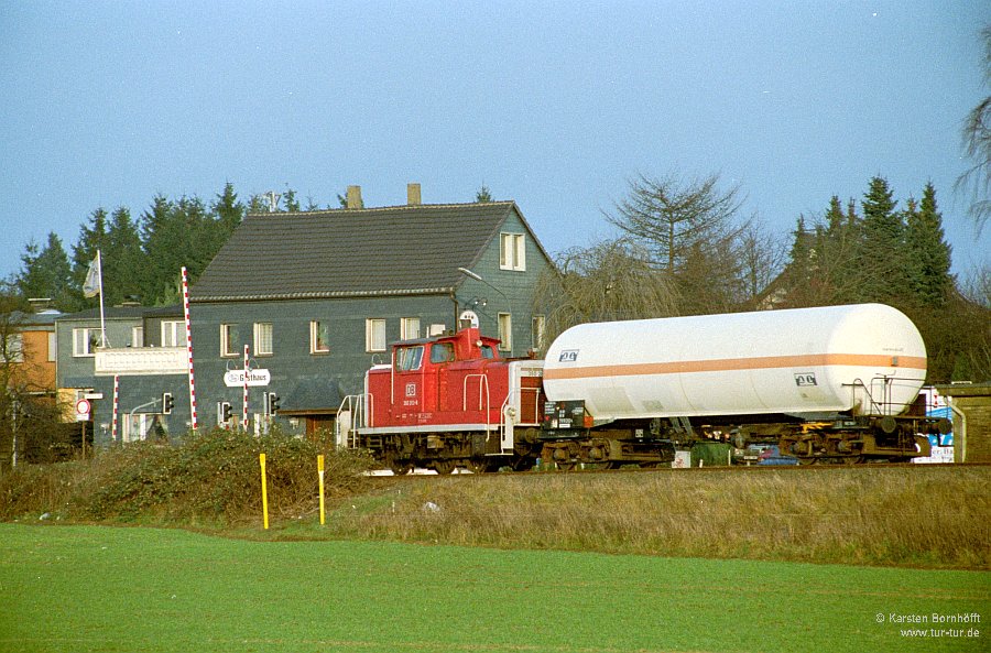 Ein halbes Jahr vor der Einstellung des Güterverkehrs auf der Strecke Wülfrath - Velbert gelangen mir am 15.12.1995 diese Fotos der Oberhausener 360 282-8 an einem Bahnübergang in Velbert-Tönisheide. Normal war täglich 1 Gaskesselwagen, wie auf den ersten beiden Fotos auf dem Weg nach Velbert Hbf zu sehen ist. |