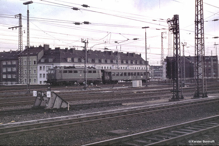 Kaum zu glauben: Das war so planmäßig ! Personenzug Düsseldorf Hbf - Duisburg Hbf, aber über Ratingen West / Lintorf / Duisburg-Wedau. Die hier am 1.10.1981 gerade in Düsseldorf Hbf einfahrende 140 250-0 hat mit ihrem Bye keine Mühe. Kurz darauf wurde auf dieser Strecke dieses letzte Zugpaar eingestellt. Es gibt jedoch Planungen, in Zukunft dort den Personenverkehr wieder aufzunehmen. |