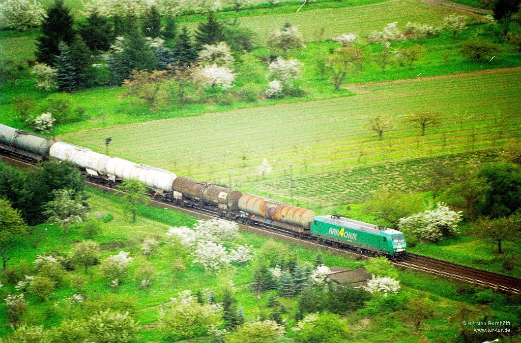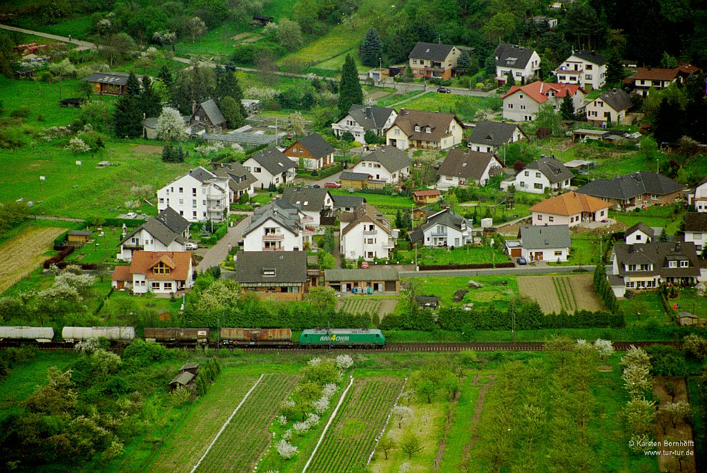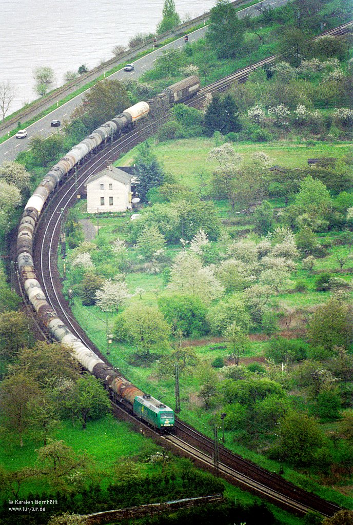 Von Boppard aus fotografiert: RAIL4CHEM 145-CL-002 durchfährt am 1.Mai 2001 mit DFG 46103 den Ort Filsen auf der anderen Rheinseite.