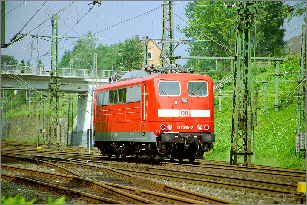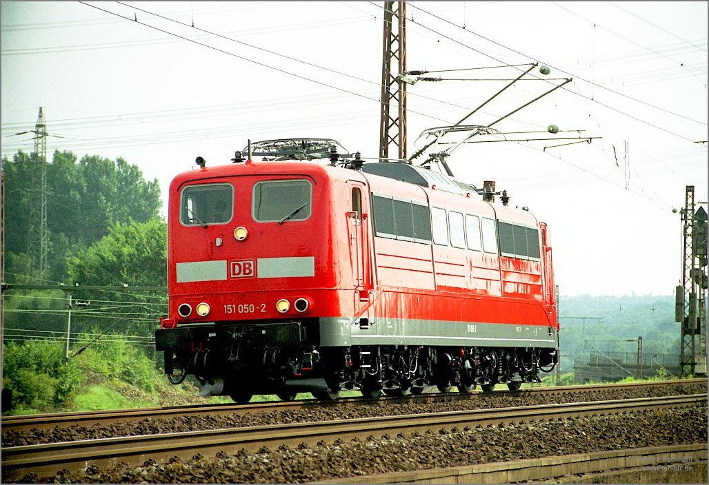 Ganz frisch hauptuntersucht und lackiert ist am 21.8.2001 in Gruiten 151 050-2 auf dem Rückweg nach Opladen.