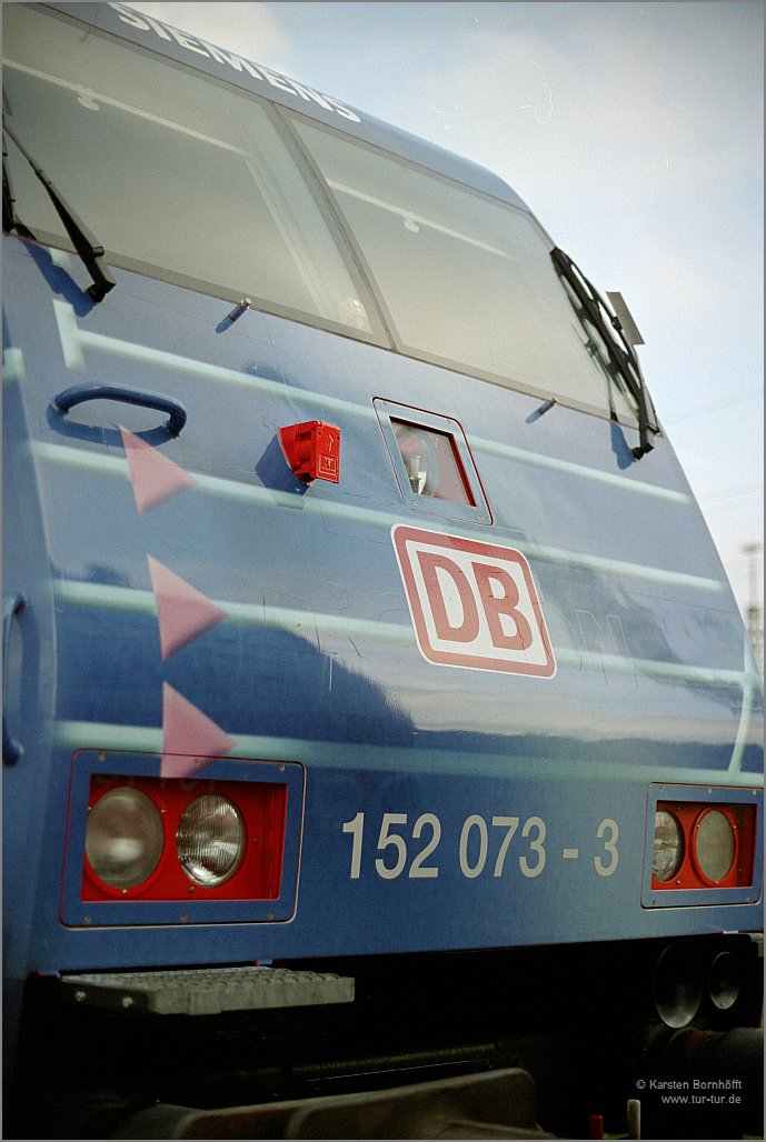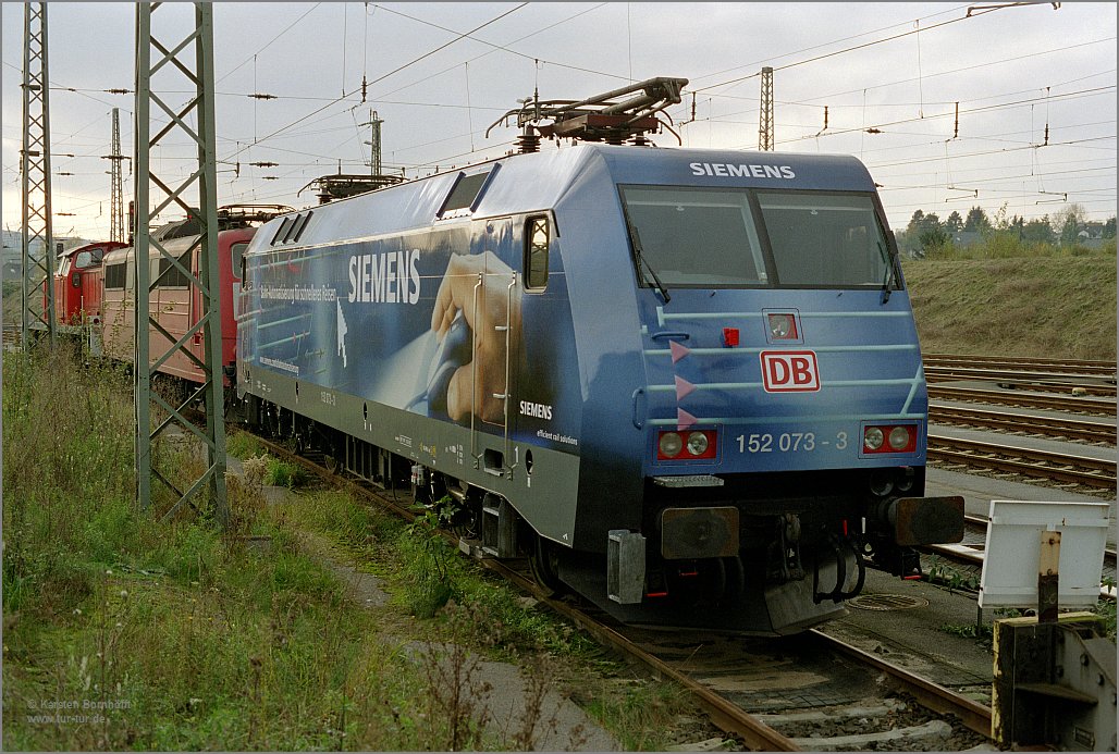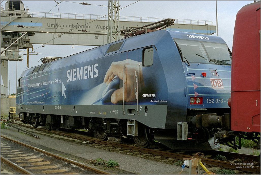 Am 3.11.2001 war 152 073-3 die neueste Werbelok der DB. Die Railion-Lok hatte als erste 152 eine Siemens-Ganzwerbung erhalten. Aufgenommen in Wuppertal-Langerfeld .