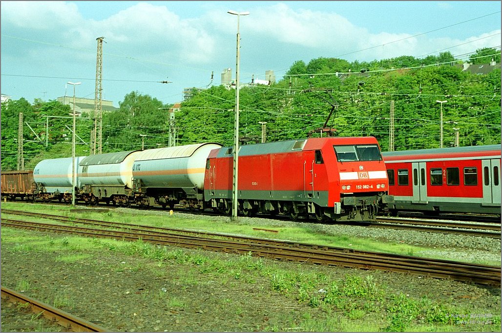 152 082-4 versuchte am 13.5.2002 mit dem IRC 51359 in Wuppertal- Steinbeck ein Wettrennen gegen eine S-Bahn. Leider hat die 152 verloren.