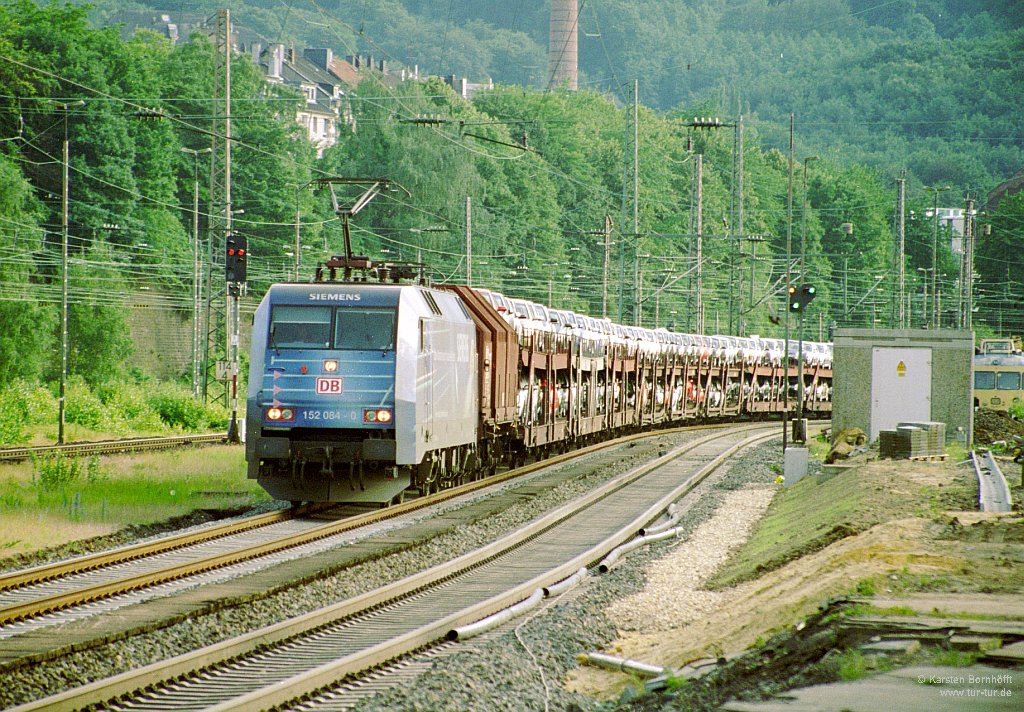 Mit dem Zug 51144 Gremberg - Hagen Vorhalle durchfährt die Siemens-Werbelok 152 084-0 am 14.6.2002 Wuppertal-Steinbeck