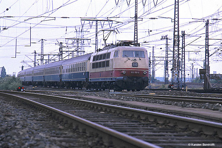 103 150-9 mit einem InterCity bei der Einfahrt nach Essen Hbf, 12.7.1981