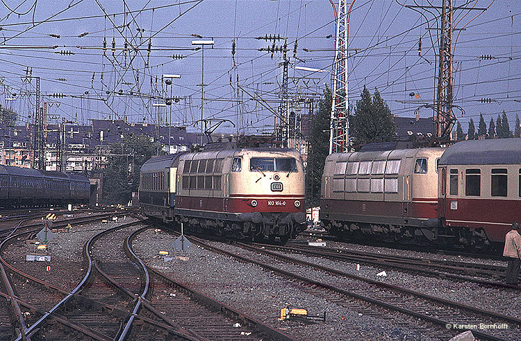 Solche Fotos waren damals alltäglich: Begegnung zweier InterCity-Züge in Düsseldorf Hbf, 103 164-0 am 1.10.1981.