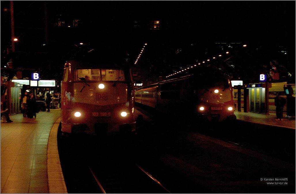 Ein Nachtfoto aus freier Hand: 103 190-5 und 103 232-5 trafen sich am Abend des 10.November 2002 in Köln Hbf.
