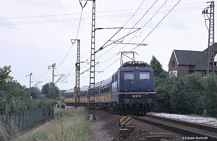 Am 9. Juni 1981 zog 110 117-9 einen Zug aus niederländischen IC-Wagen von Köln-Deutz nach Venlo. Hier kurz vor dem Ziel bei der Einfahrt in Kaldenkirchen.