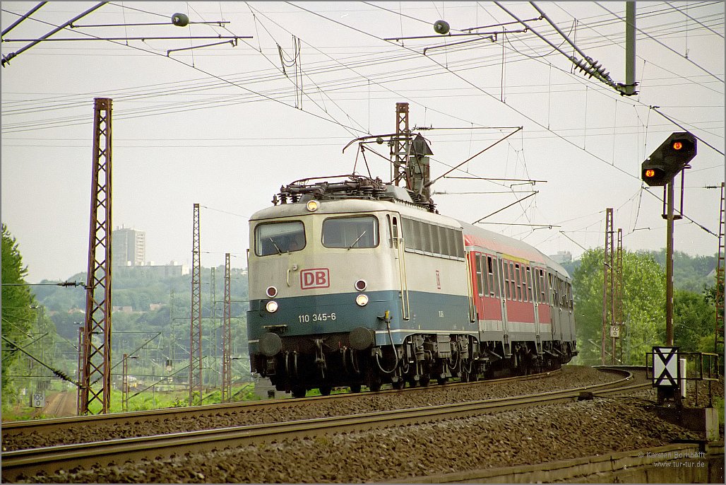 Damals war sie ganz neu in Köln und noch dazu in ozeanblau/beige lackiert: 110 345-6 mit einem Regionalexpress nach Koblenz kurz vor Gruiten, 21.8.2001.