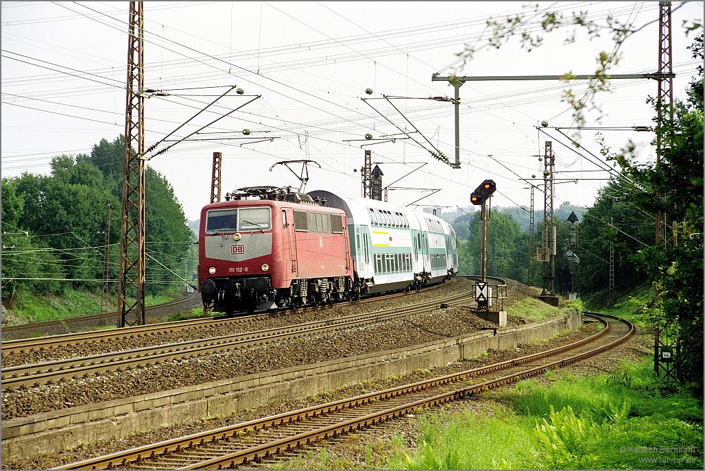 Am 21.8.2001 begnete mir in Gruiten die damals orientrot lackierte 111 112 mit einem Doppelstockzug nach Aachen.