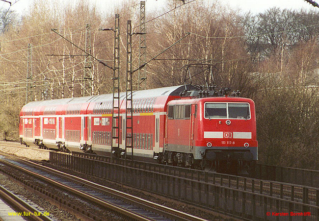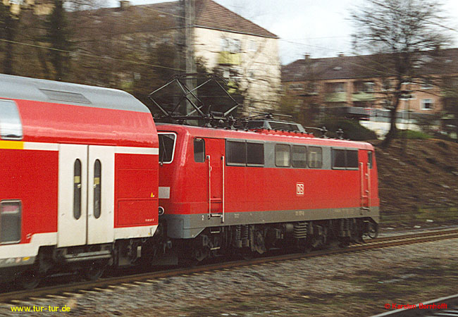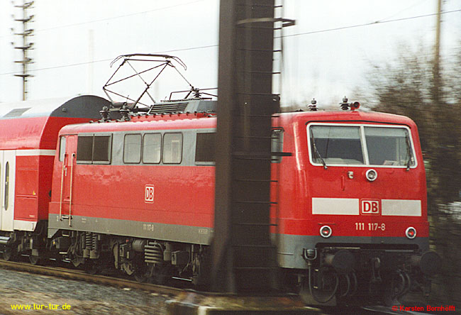 Auch das hat es gegeben: Die Dortmunder 111 117-8 war im Februar 2002 etwa eine Woche lang mit nur einem Stromabnehmer im Einsatz. Gesehen und fotografiert in Wuppertal-Sonnborn am 23.2.2002.