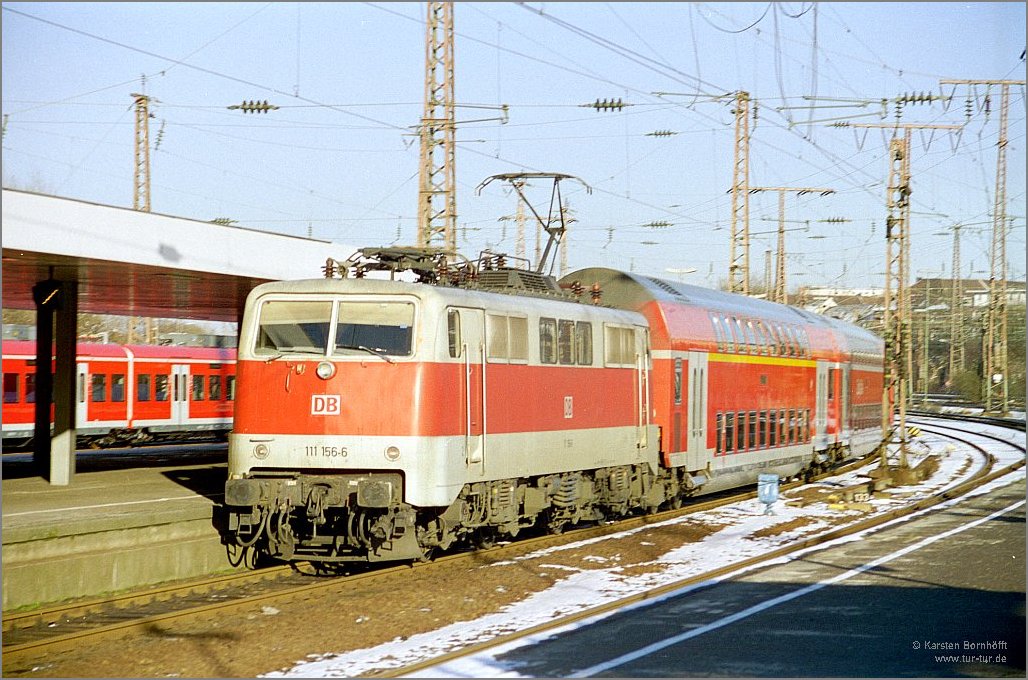 Bei vier ehemaligen Düsseldorfer-S-Bahn-Loks wurden im Bh Frankfurt der ursprünglich orangene Streifen rot umlackiert. 111 156-0
