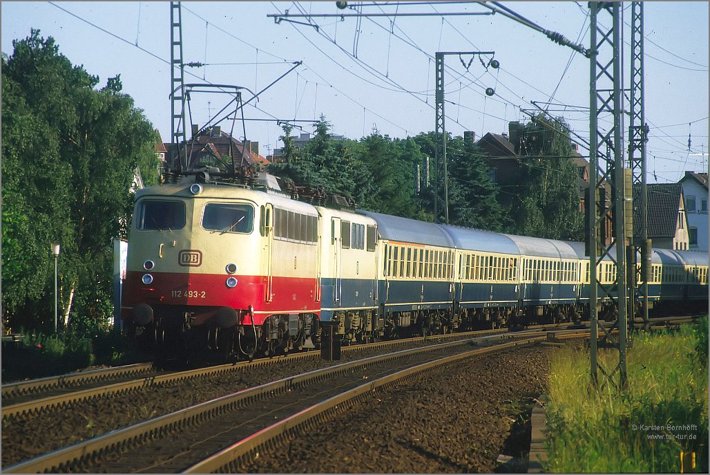 112 493-2 hat gerade als Vorspannlok vor einer 111 den Bahnhof Lüneburg verlassen. August 1986.