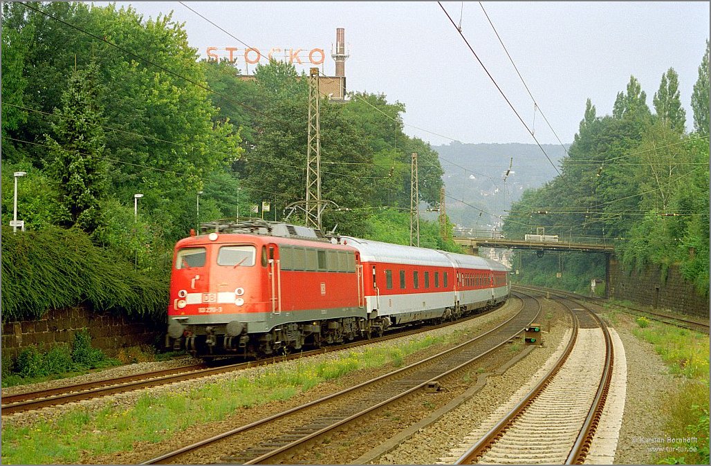 Der DB Autozug AZ 13407 Hamburg-Altona - Livorno wurde am 28.8.2002 von der ehemaligen Rheingold- und TEE-Lok E10 1270, jetzt 113 270-3 vom Bh München durch Wuppertal-Sonnborn gezogen.
