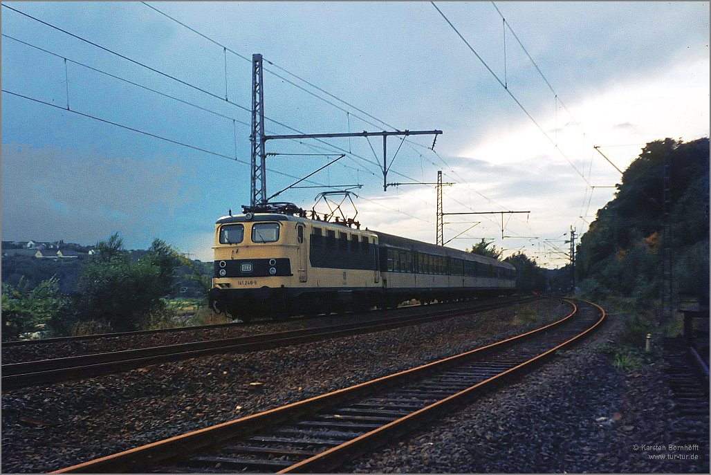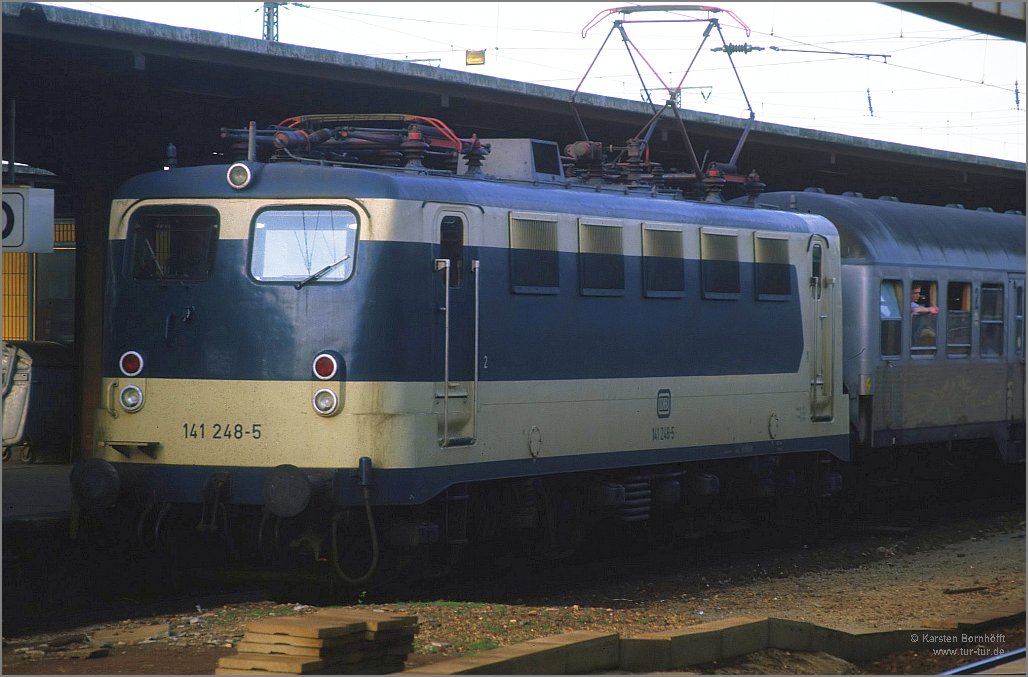 Zum Schluß noch ein schlechtes Bild der Lok von vorne mit dem dazugehörigen Zug. 141 248-5 in Bochum-Dahlhausen Mitte der 80ger Jahre.