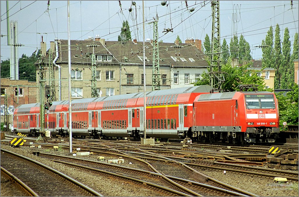 Mit einem Zug der Linie RE5 nach Koblenz hat 146 016-1 am 7.6.2003 Düsseldorf Hbf erreicht.