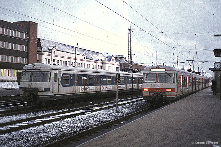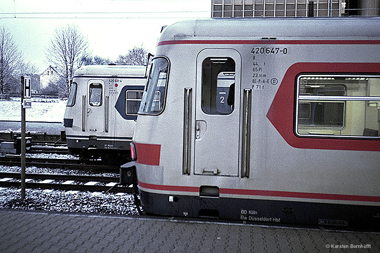 Im Februar 1982 war 420 131 vom Bw München-Steinhausen leihweise in Düsseldorf im Einsatz. Hier steht er abgestellt neben dem Düsseldorfer 420 147 in Ratingen Ost.