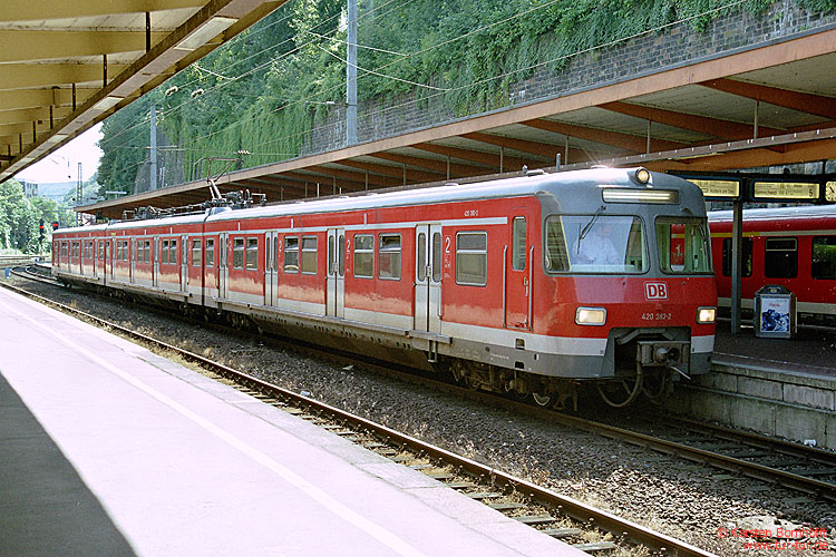 Seit Mitte Juni 2004 werden wieder Elektrotriebwagen der Baureihe 420 von Essen aus eingesetzt. Der hier am 20.7.2004 in Wuppertal Hbf aufgenommene 420 383-2 verkehrte auf der Linie S9 Wuppertal - Haltern am See.