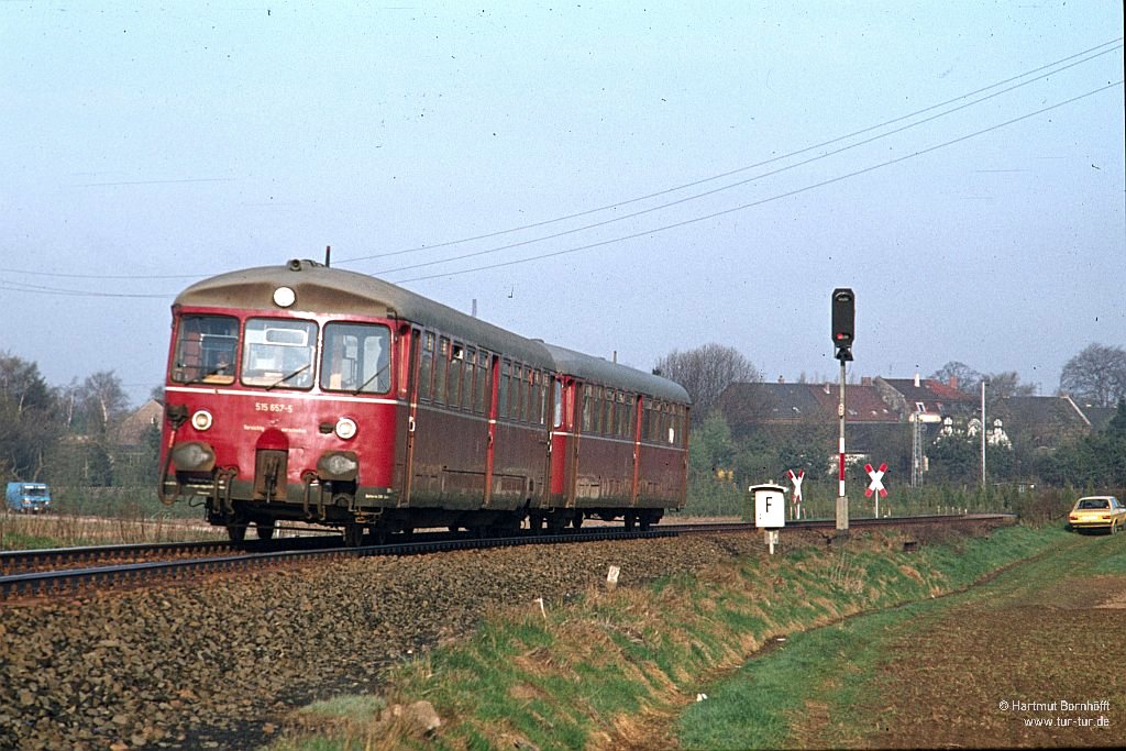Nochmal der Morgenzug Kaldenkirchen - Kempen. Diesmal war 515 657-5 mit einem 815-Beiwagen im Einsatz. Kaldenkirchen, Anfang der 80iger Jahre. Der Personenzugverkehr zwischen Kaldenkirchen und Kempen wurde am 21. Mai 1982 eingestellt.