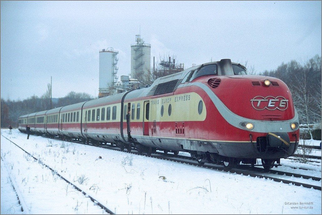 Als Nikolaus-Sonderfahrt erreichte am 6.12.1998 die Hammer-TEE-Garnitur aus 601 014-4 und 601 019-3 den sonst nur im Güterverkehr bedienten Bahnhof Dornap-Hahnenfurth.