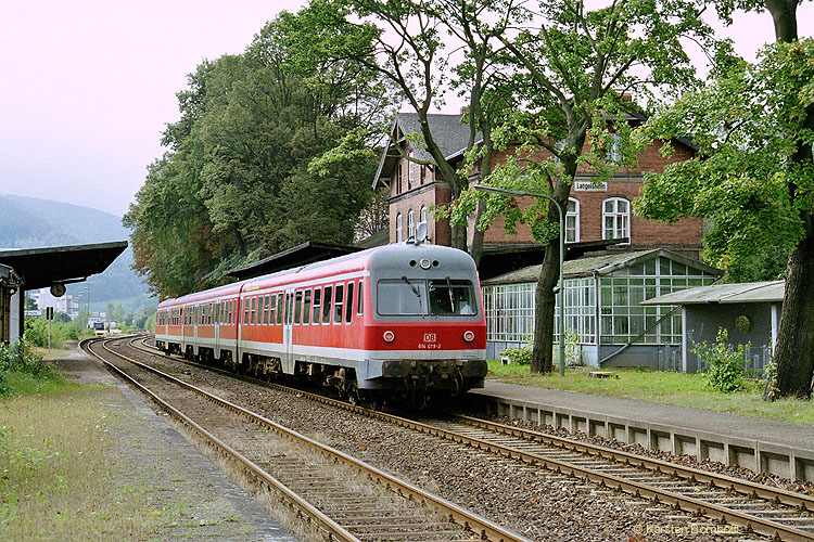 Der Braunschweiger Triebwagen 614 079-2 / 914 039-3 / 614 078-4 hat auf der Fahrt nach Goslar am 17.9.2002 gerade den Bahnhof Langelsheim erreicht.