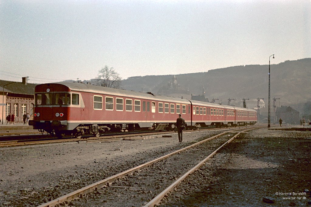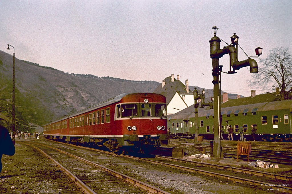 Am 13.4.1968 standen die Trierer VT24 619 und VT24 620 mit einem unbekannten Mittelwagen im Bahnhof Cochem. Die DB-Doppelstock-Prototypwagen von Typ DByg rechts im Bild waren im Rahmen einer Sonderfahrt mit 41 352 von Köln nach Trier und zurück unterwegs. |