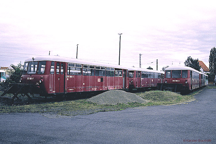 Auch zahlreiche rote Schienenbusse standen am 18.9.2002 im ehemaligen Bw Nordhausen abgestellt: 772 165-7, 972 705-8 und 972 765-2.