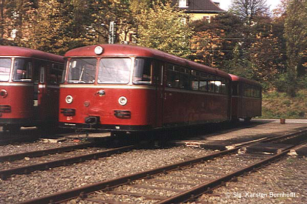Ein unbekannter 795 mit Beiwagen 995 steht abgestellt im Bw Wuppertal-Vohwinkel. Heute wächst hier Gras.